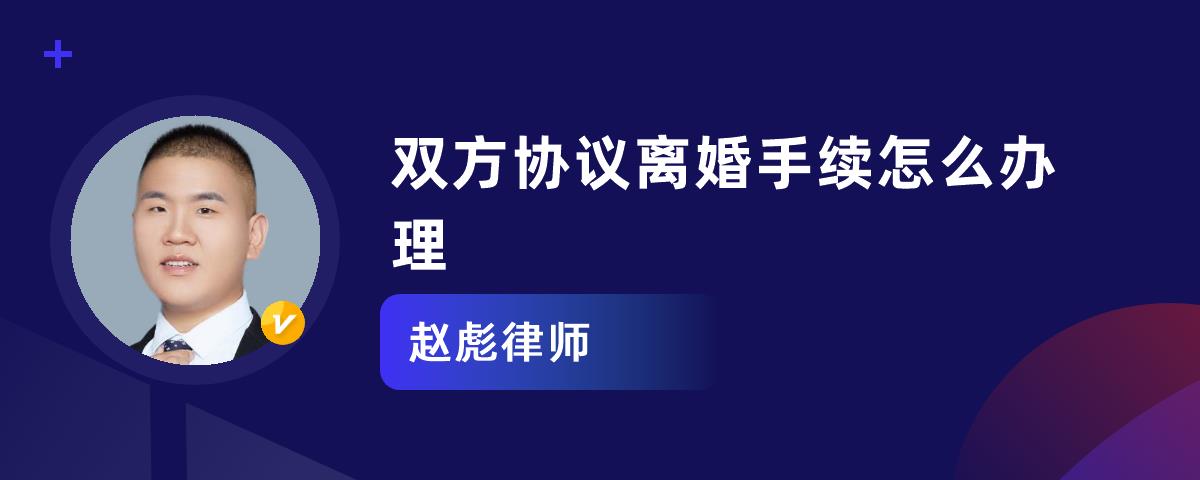 1、双方协议离婚手续这样办理:男女双方自愿订立书面离婚协议,并共同向一方户籍所在地婚姻登记机关提出离婚登记申请。符合条件的,经过三十天冷静期,即可领取离婚证