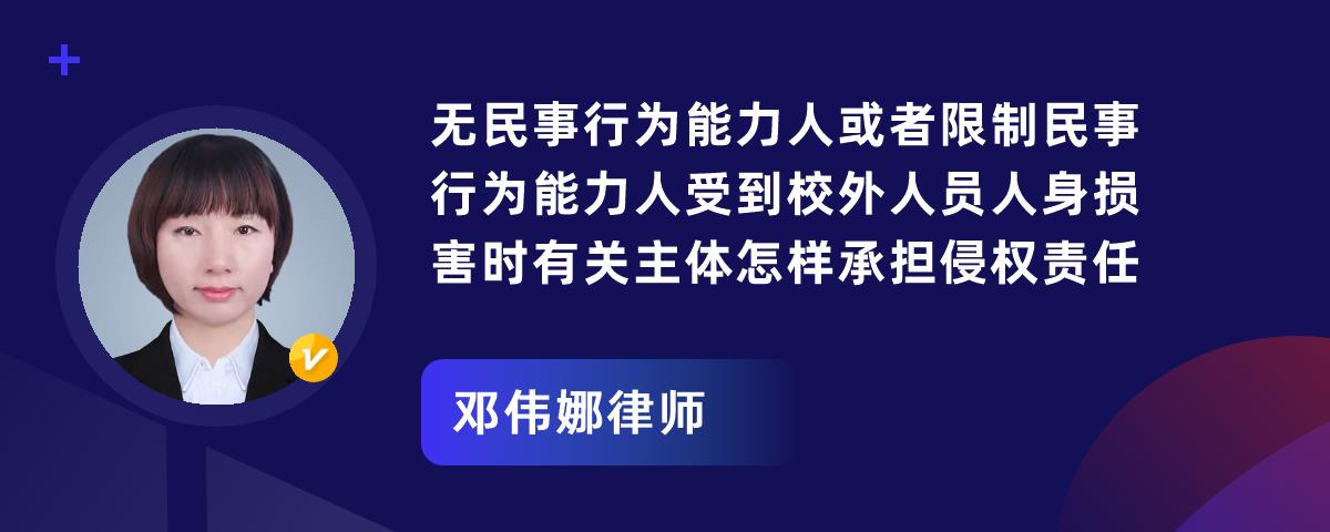无民事行为能力或限制民事行为能力人应当承担的责任是:民事赔偿责任,无民事行为能力人、限制民事行为能力人有财产的,从其本人的财产中支付其造成他人损害的赔偿费用;不足部分,由监护人赔偿。限制民事行为能力人在其具有行为能力的范围内还可能承担刑事责任。
