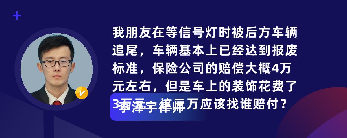 我朋友在等信号灯时被后方车辆追尾,车辆基本上已经达到报废标准,保险公司的赔偿大概4万元左右,但是车上的装饰花费了3万元,这三万应该找谁赔付?