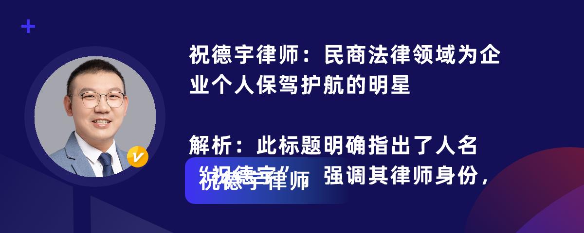 律师介绍:祝德宇是江苏善合律师事务所专职律师,凭借专业素养、负责态度和丰富经验,为民商领域法律事务保驾护航。专注领域:深耕民商与非诉业务,涉及合同纠纷、公司治理等,能事前预防法律风险,凭借专业知识提供解决方案。丰富经验:担任多家企业及机关单位法律顾问,为企业提供全方位支持,协助机关处理法律事务,获高度认可。成功案例:和团队成功办理多起复杂民商事案件,如某巨额合同纠纷,为委托人挽回损失。服务理念:秉持“受人之托、忠人之事”,认真负责,注重服务体验,是值得信赖的法律伙伴。