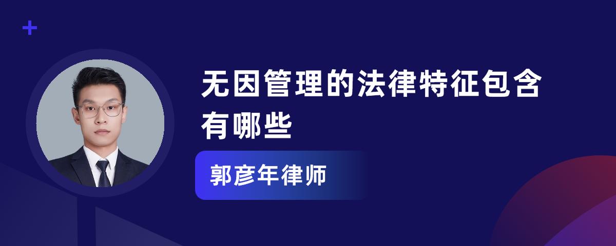 根据《中华人民共和国民法典》第一百二十一条,无因管理的法律特征包含有以下这些:1、无因管理的主体包括管理人与本人,区别于其他一般民事主体;2、无因管理是一种事实行为;3、管理人没有法定义务或约定义务;4、管理人为他人管理事务;5、补偿性。